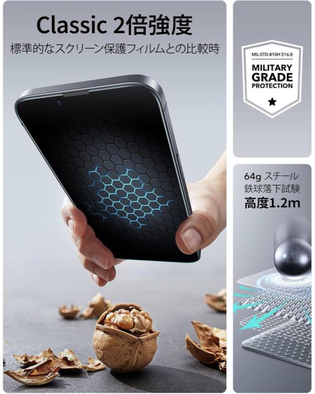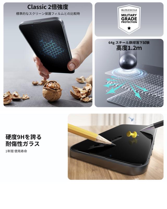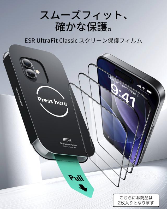 【UltraFitで瞬間貼り付け】スクリーン保護フィルムの専用貼り付けツールであるUltraFitトレイとクリーニングキットが付属しており、気泡のない素早い保護フィルム貼付けが行えます。説明書に目を通してから、貼り付けツールをご利用下さい。【気泡・ホコリ防止】高度なマイクロナノ粘着技術により、透明な画面の品質を維持しながら、気泡やほこりのない完璧貼付けを可能にします。【気泡・ほこりの無い貼り付け】高度なマイクロ粘着技術によって、オリジナルの高透過度スクリーン品質を維持しながら、気泡・ほこりが混入せず綺麗にフィットします。【米軍MIL規格の保護力】最大15kgの耐衝撃性を備える超タフな強化ガラスは、落下、衝撃、傷に耐え抜き、あらゆる日常使用シーンから画面を守り抜きます。【梱包内容】ESR Armoriteスクリーン保護フィルム(2枚)、UltraFitトレイ、クリーニングキット、マニュアル。
