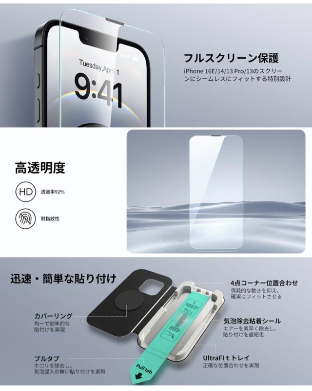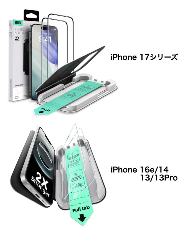 【3秒で完成/全面保護/2枚入り】ESR iPhone 17/16 17 Air 17 Pro 17 Pro Max 17e 16e フィルム iPhone14/13/13 Pro ガラスフィルム 9H強化ガラスフィルム 貼付け簡 自動吸着 防塵保護 米軍MIL規格保護 気泡無し ガラスフィルム UltraFitトレイ付