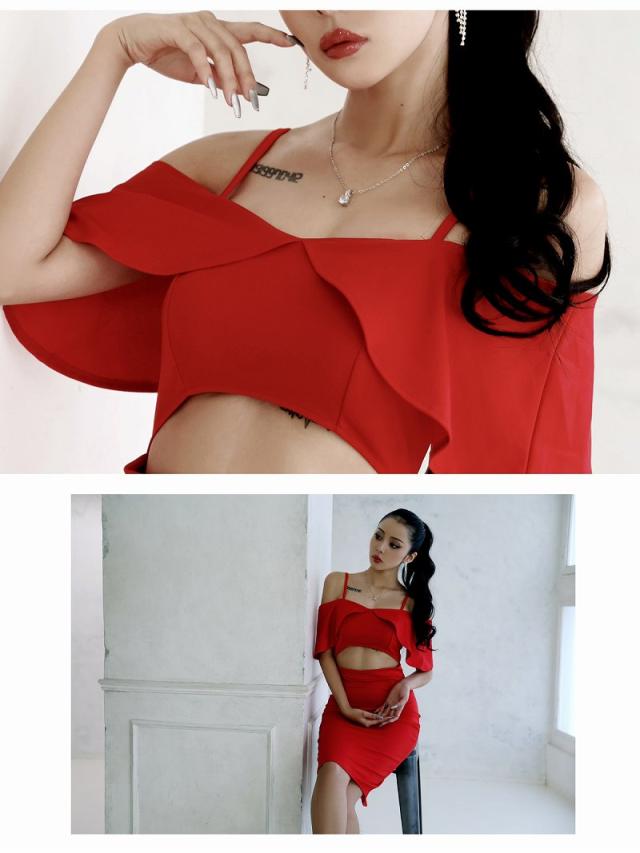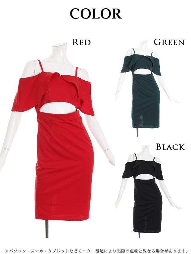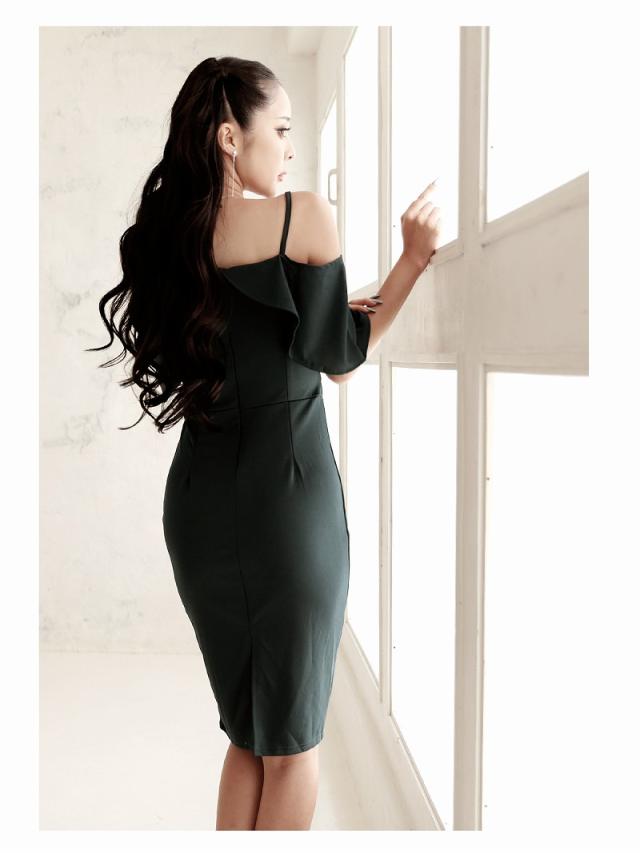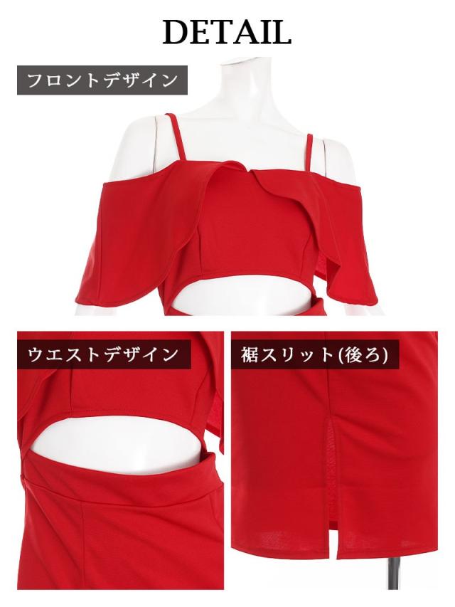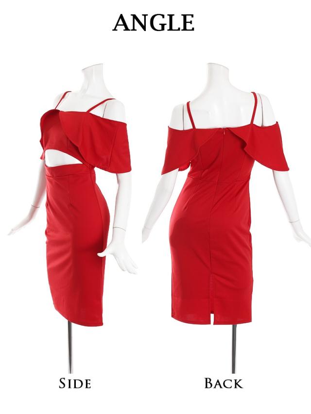 ☆色気あるボディラインに魅せてくれるフィット感が魅力的なタイトドレスにはお腹をチラ見せできちゃうカットデザインが施されておりさり気なくセクシーさもアピールできるオフショルドレスです♪