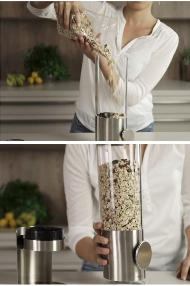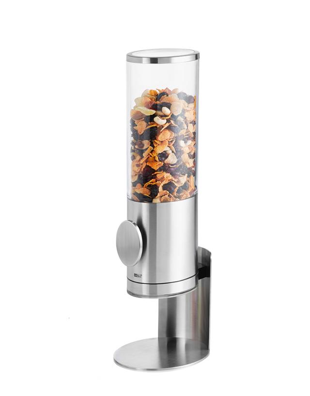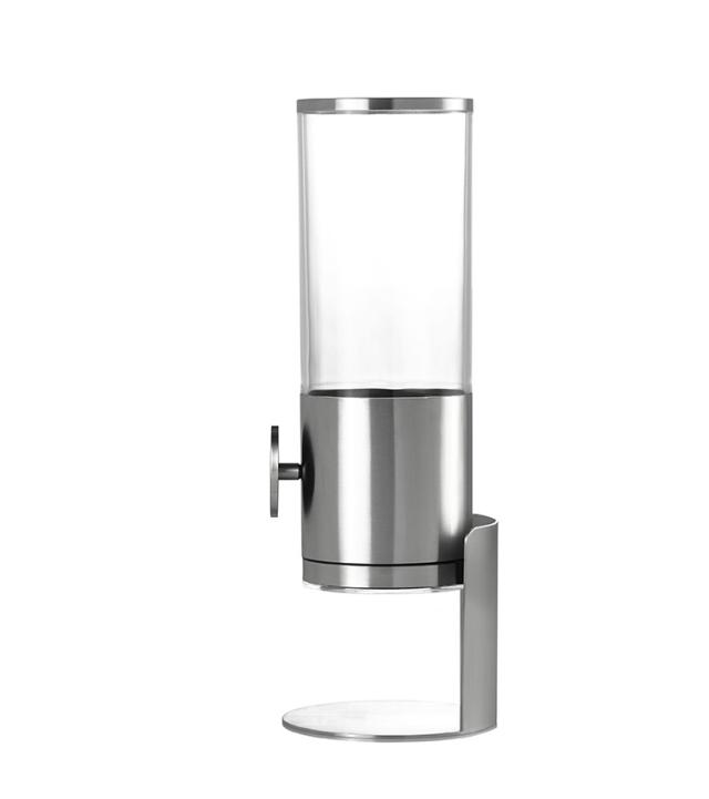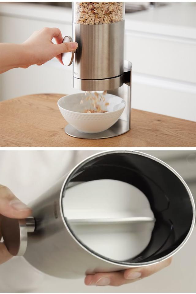 シリアルやキャンディ、オートミール、ドライフルーツなどを保管しながら適量を盛り付けることができるステンレス製のディスペンサーです。ハンドルを回すと、中にあるシリコン製のプレートが回転して一定量が出てきます。回すだけの簡単操作なので小さなお子様でも使うことができます。上部のフタを外して上から補充が可能。コンテナ部分を外して付属の下フタを付ければコンテナ部分だけを保管することも可能、長期間、家を留守にする時などに便利です。普段のお手入れは柔らかい布を濡らして軽く拭くだけでOK。しっかりとお手入れしたい場合はパーツをバラして簡単に水洗いができます。