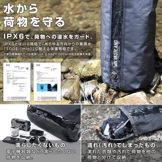 荷物の水濡れを防ぐ【IPX6】の「防水ドライバッグ」です。電子機器など濡らしたくない荷物や、水着など濡れてしまった(汚れてしまった)荷物の収納時に活躍します。※第三者機関にてJIS規格(JIS C 0920:2003)の防水試験を実施