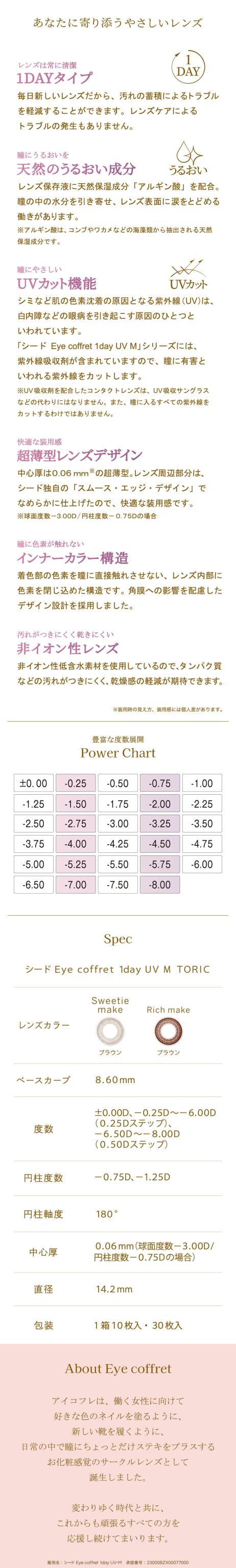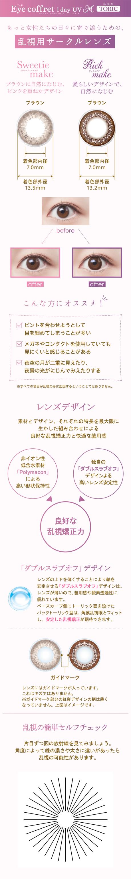 乱視をお持ちの方にもお使いいただける、瞳の輪郭を際立たせる1日使い捨て乱視用サークルレンズ。天然うるおい成分配合、瞳にやさしいUVカット機能付き。超薄型レンズで、快適な装用感です。