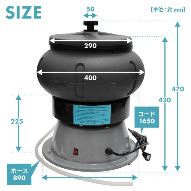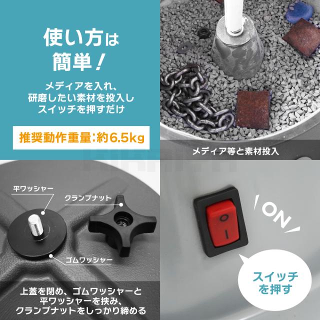 錆の除去・バリ取り・研磨に最適な振動式タンブラー! ●錆が付いた金属、バリが付いた金属、天然石、ガラスなどを振動で研磨できます ●フタは振動による揺れを抑えるゴムが付いています ●使い方はタンブラーの中にメディアを入れ、研磨したい素材を投入しスイッチを押すだけ ●推奨動作重量は約6.5kgです ●メディアはボウルの半分以下、水を使用する場合は1/3以下でご使用ください ●使用できるメディアは多種多様です ●研磨時の音量は93dB(カラオケ店内中央と同等)です ※野外で1m離れた場所にて計測 ※タンブラーは必ず床で、水平な場所で使用してください ※防水仕様ではございませんので、水の使用時はボウル以外が濡れないようご注意ください ※ラバーフットは摩擦により、床に黒く跡が付く場合があります ※連続稼働する場合は、様子を見ながら使用してください ※振動により部品が緩む場合がございますので、定期的に点検してください |