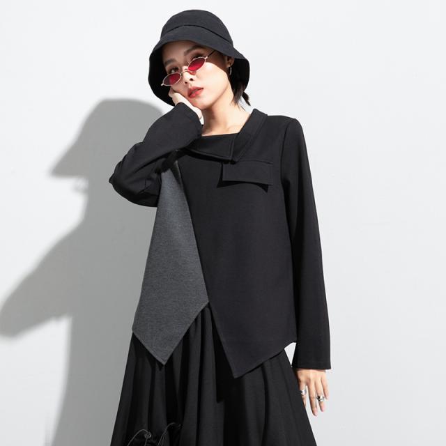 アシンメトリーな変形裾のモードスタイルなトップス。