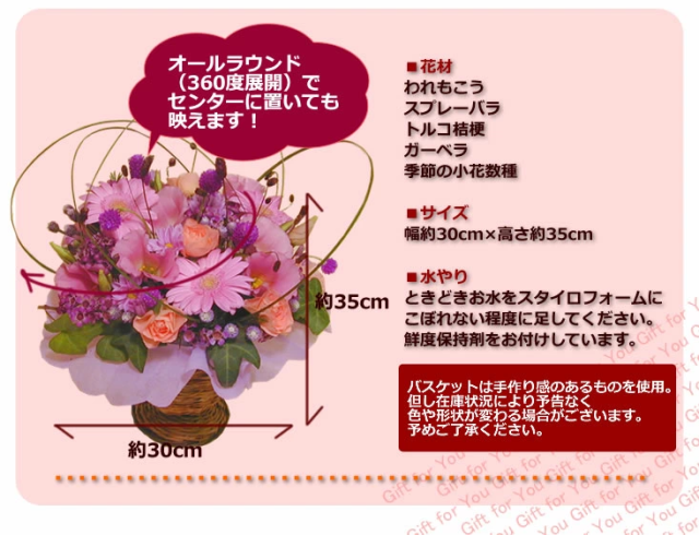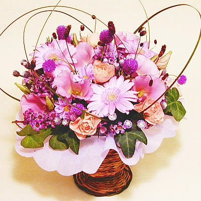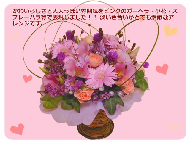 ■花材:ピンクのガーベラ、トルコキキョウ、ピンクの小花、スプレーバラ、ワレモコウ、ストロベリーフィールド紫など