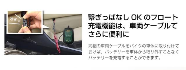 ・車両ケーブルは、バッテリーをバイクに載せたまま補充電を行う際に使用します。バッテリーをバイクに搭載する際、ボルトと一緒に締めこむことでワンタッチで充電器と接続が可能になります。