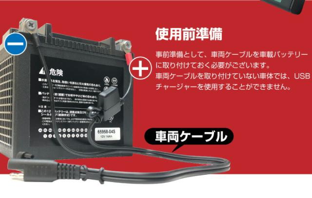※USBチャージャーは12Vバッテリー専用です。充電器とは絶対に直接接続しないでください。
