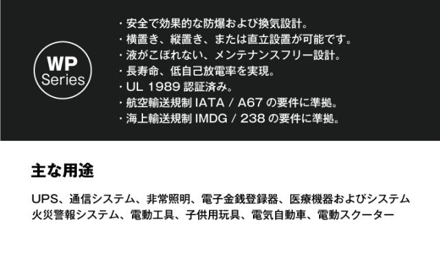 ■使用用途:小型12V機器、子供用電動自動車、音響機器、移動無線、防災・防犯システム、非常用照明設備、非常通報システム機器、消防設備 など