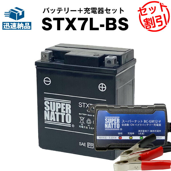 バイクバッテリー充電器+STX7L-BS セット■バイクバッテリー■YTX7L-BSに互換■ボルティクス・スーパーナット【送料無料】【特別割引】グラストラッカー バリオス、ST250、KLX250 BALIUS、D-TRACKER D、ジェイド、Vツインマグナ【新品】