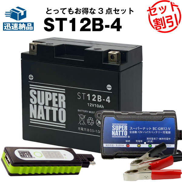 バイクでスマホ充電 USBチャージャー+充電器+シールド型ST12B-4 セット■バイクバッテリー■YT12B-BS GT12B-4 FT12B-4 12V12B-4に互換 スーパーナット充電器(12V) 送料無料/在庫有り・即納【新品】