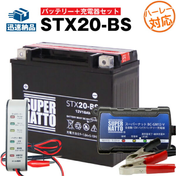 バイクバッテリー充電器+バッテリー電圧テスター(12V用)+ハーレー用 STX20-BS セット■バイクバッテリー■65991-82B 65991-82A 65991-75C互換■XLH スポーツスター,XL,XLCR,XLS ロードスター,XLX-61,XR1000,FXE1200 スーパーグライド,FXS1200 ロウライダー 他(液入済)