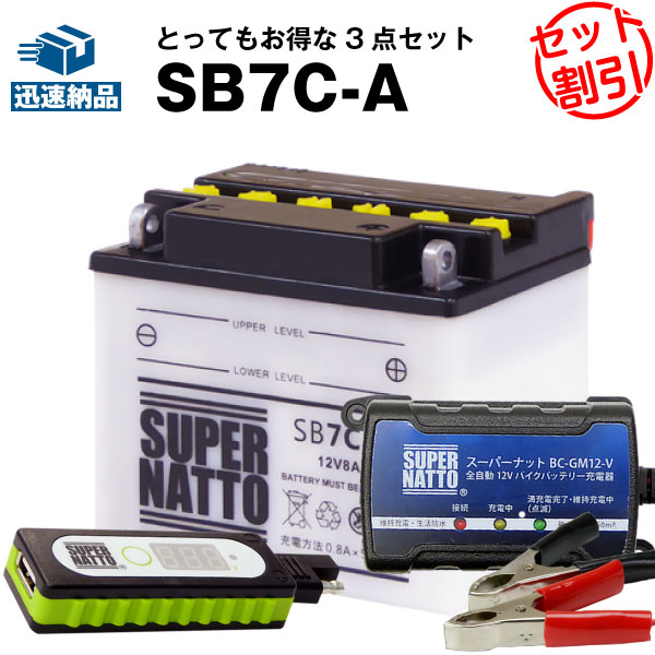 バイクでスマホ充電 USBチャージャー+充電器+SB7C-A セット■バイクバッテリー■YB7C-A GM7CZ-3D 12N7C-3D互換 スーパーナット充電器(12V)(液入済)