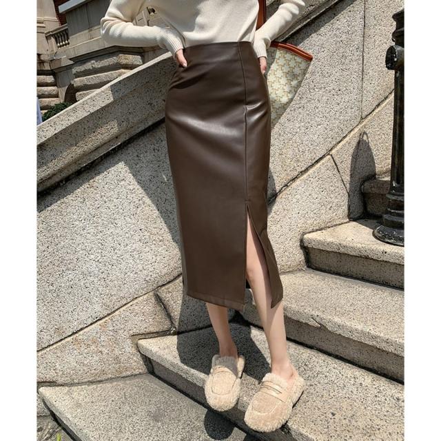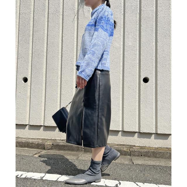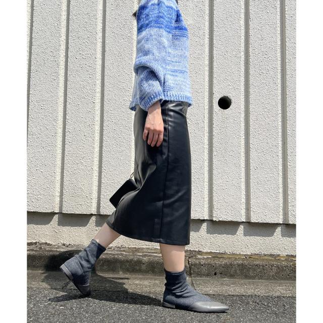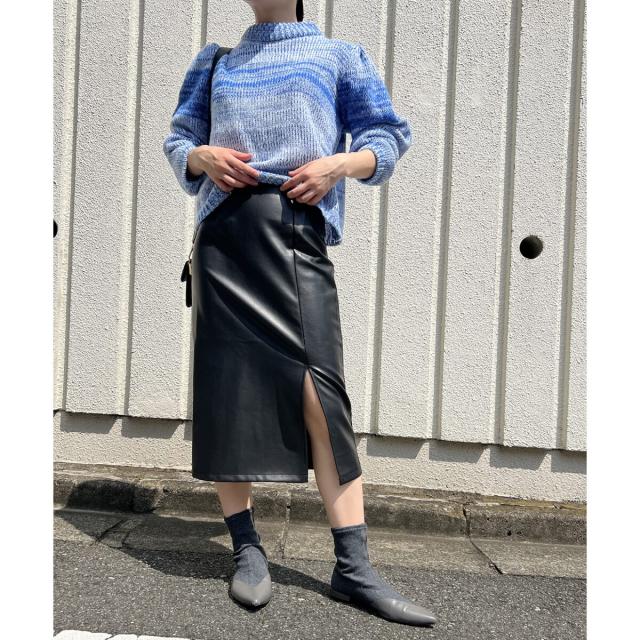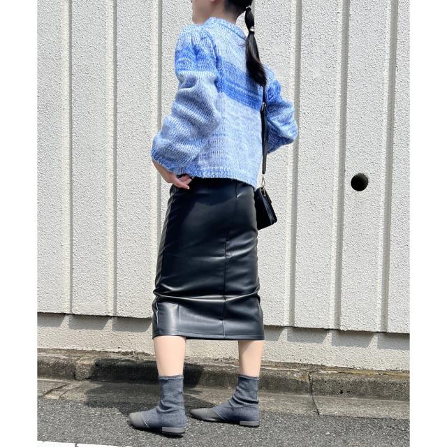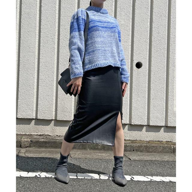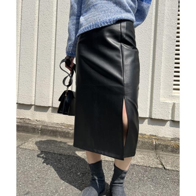 フェイクレザーを使用したミディ丈のタイトスカートです。