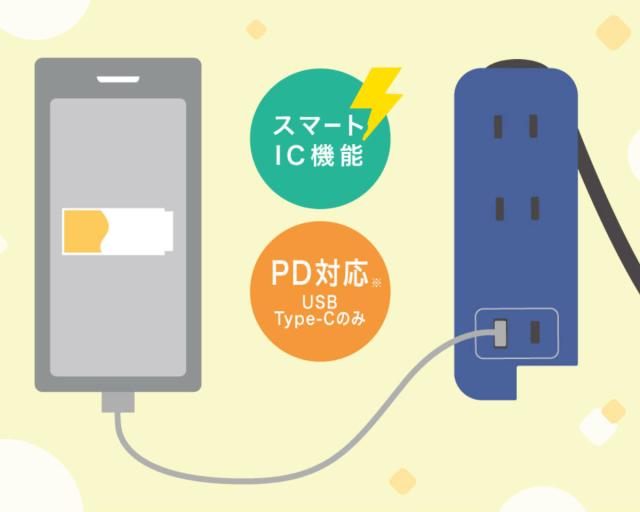 USB type-CはPD(Power Delivery)18W対応で急速充電が可能です。接続機器を自動的に検知し、最適な電流で充電を行うスマートIC機能付きです。ACプラグの根本に絶縁処理を施した、トラッキング防止プラグを採用しています。