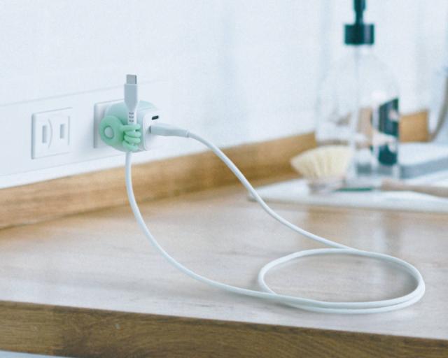 やわらかシリコン素材のケーブルリングは束ねてスッキリまとめられます。本体バンドに取り付ければ、コンセントに挿した状態でもコネクタを浮かせることができます。