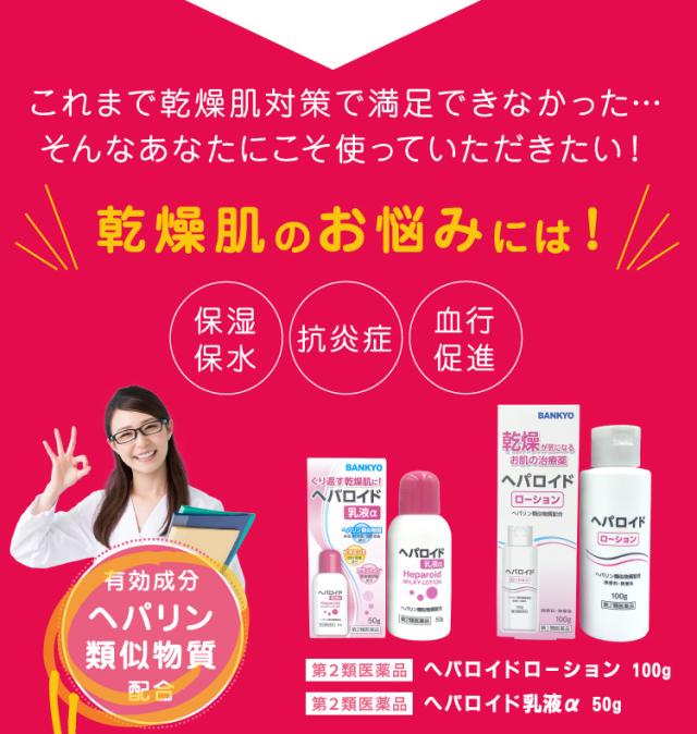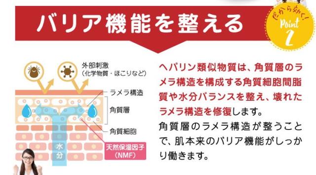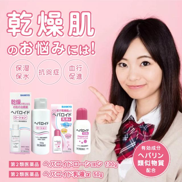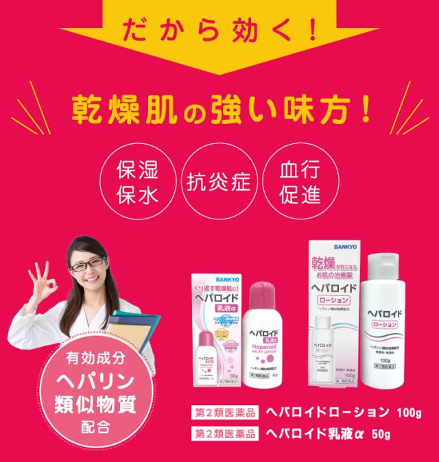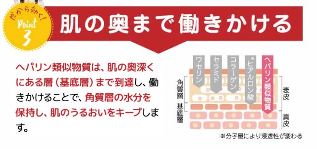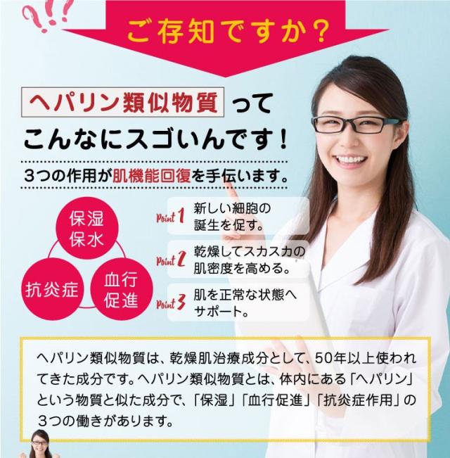 乾燥肌・肌荒れにお悩みの方のために開発した医薬品です。医療用医薬品でも使用されているヘパリン類似物質を0.3%配合しています。