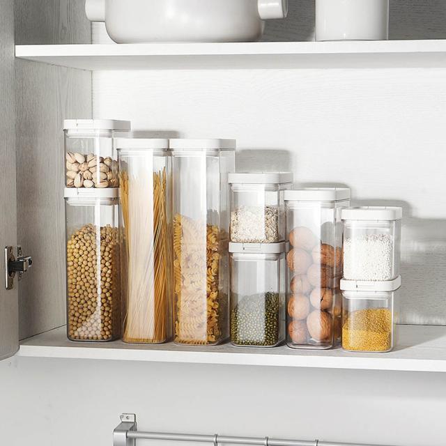 キッチン棚やキッチンパントリーなどの収納スペースががきれいに仕分けでき、スッキリとします。種類別に積み重ねて見やすく収納することもできます