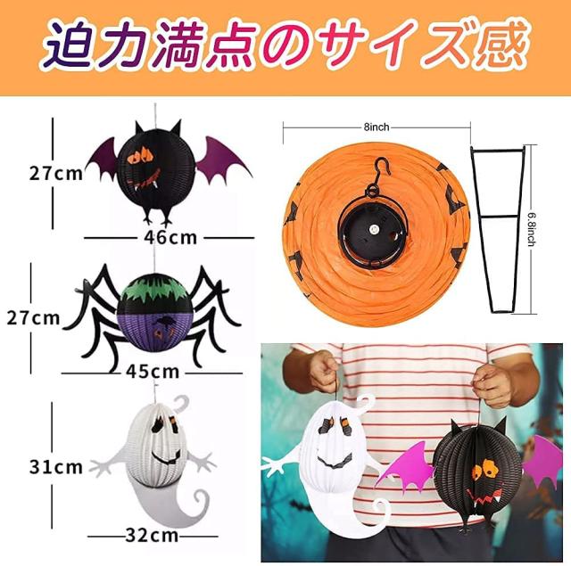 【商品説明/デザイン種類】ハロウィンデザインの6種の提灯と3種の紙装飾のセットです。迫力満点のサイズ感で空間の雰囲気を一気に変えることができます。