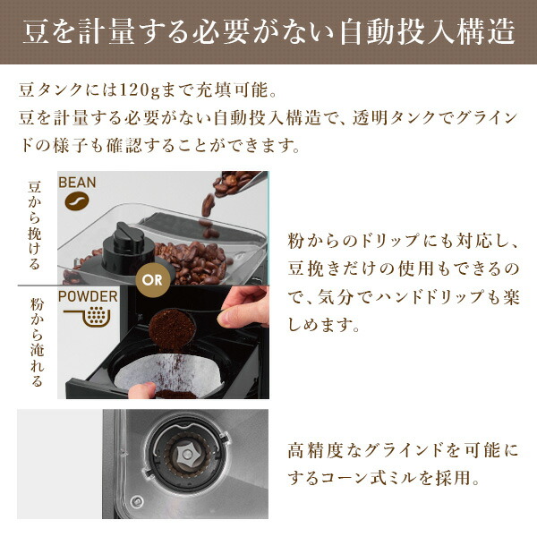 | 商品説明 | ●電源:AC100V(50/60Hz) ●定格消費電力:980W ●水タンク容量:650ml ●抽出方式:ドリップ式 ●ミル方式:コーン式 ●コーヒーミル最大容量:120g ●1-5杯分抽出可能 ●ホットコーヒー、アイスコーヒーの選択可能 ●アロマボタンで味わいを選択 ●タイマー機能搭載 ●付属品:計量スプーン、掃除用ブラシ、ペーパーフィルター(5枚)、ユーザーズガイド(保証書含む) ●メーカー保証:1年間 ※2023年10月よりグレージュ色を追加しております |
