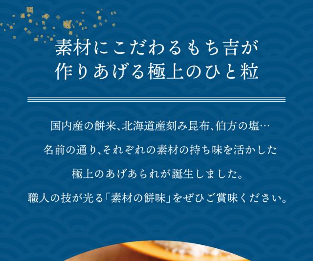 もち吉がこだわり抜いた餅米と水を使用したあられに 風味豊かな北海道産刻み昆布を練り込み、 ほんのり甘みのある伯方の塩をまぶしました。