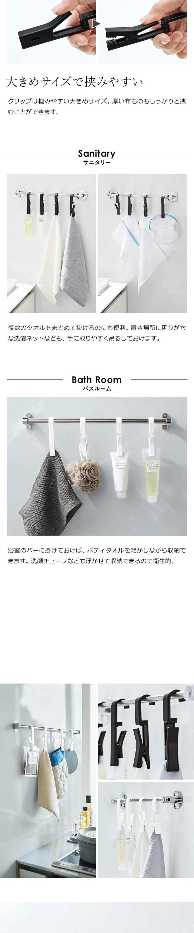 キッチンや洗面所、浴室などのタオルバーに掛けて使えるクリップ。キッチンやバスの小物を強力クリップに挟んで吊り下げ収納が可能。クリップ部分は360度回転しお好みの位置で使えます。