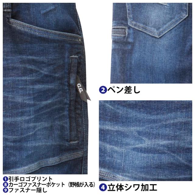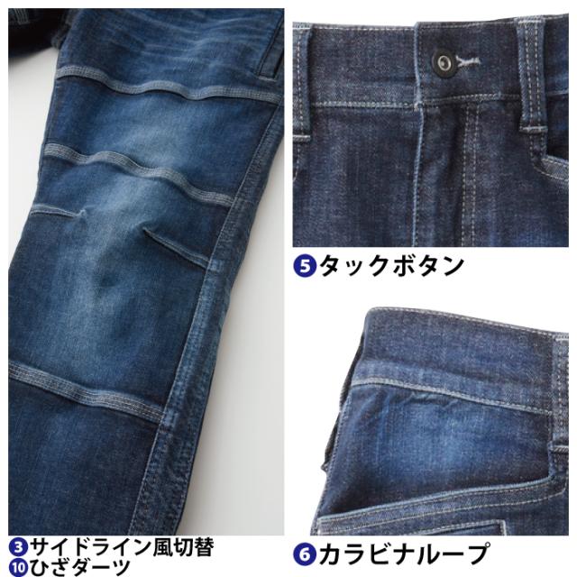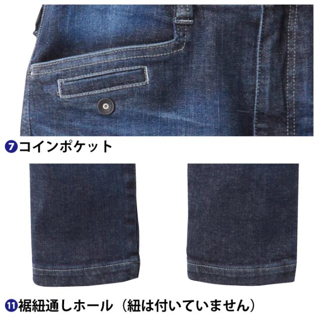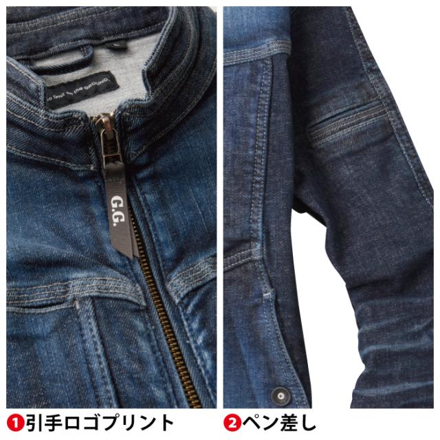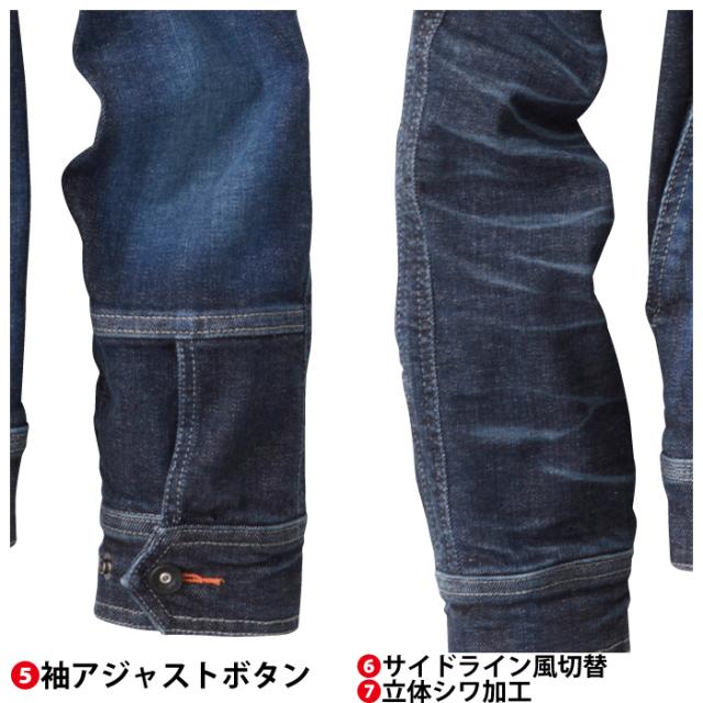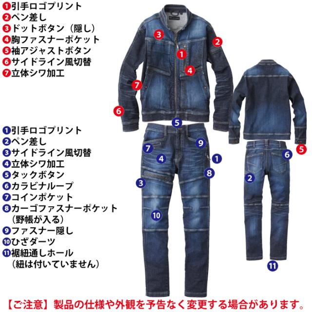 ◇機能:ストレッチ・吸汗性・製品洗い・児島加工・伸長率85%・伸長回復率87%・11oz・引手ロゴプリント・ペン差し・ドットボタン(隠し)・胸ファスナーポケット・袖アジャストボタン・サイドライン風切替・立体シワ加工