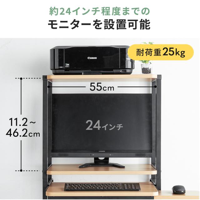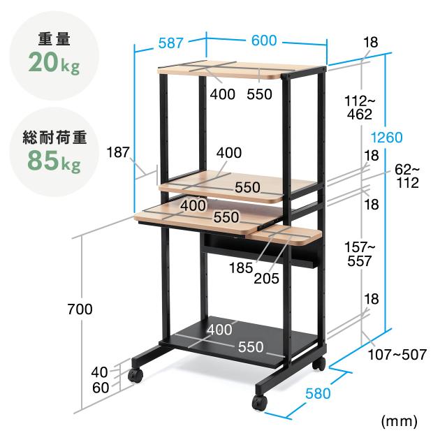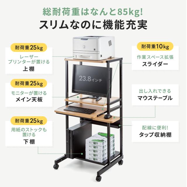■総耐荷重:85kg、メイン天板/25kg、上棚/25kg、下棚/25kg、キーボードスライダー/10kg