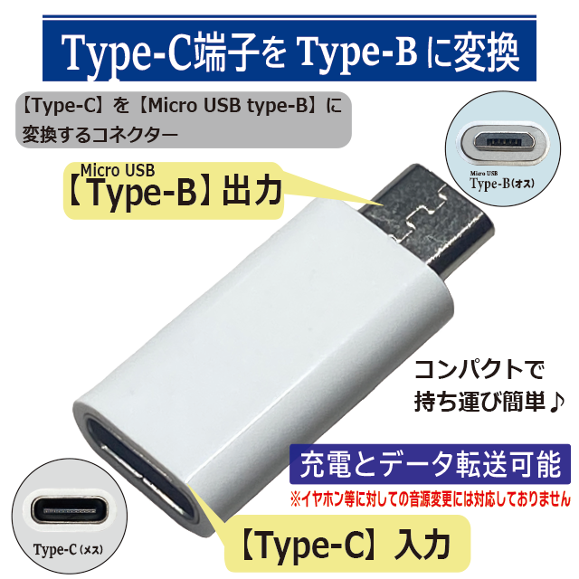 - 古いスマホの充電器の差し込みがぐらついて充電が出来なくて困っていたところ、このC タイプからB タイプに変換するのを見つけて即購入しました。差し込みのぐらつきもなく快適に充電できます。値段も安いのでま...