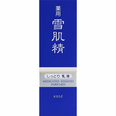 薬用 雪肌精 乳液 エンリッチ (しっとり) (医薬部外品) : 140mL 5,000円 (税抜) 。和漢植物の力に着目。自然のめぐみ、明るい透明感。ふっくら心地よい感触で肌にひろがり、弾力感のある、やわらかな肌にととのえる薬用美白乳液です。しっとり濃密なうるおいが、美白有効成分とともに角層を満たします。ハトムギ (?苡仁) エキス、トウキ (当帰) エキス、メロスリア (白?) エキス、センプクカ (旋覆花) エキス、バクモンドウ (麦門冬) エキス、テンニンカ (天人花) エキス、グリセリン (保湿) 配合。有効成分が美白効果を発揮。メラニンの生成を抑え、日やけによるシミ、ソバカスを防ぎます。肌あれ、乾燥を防ぎ、お化粧映えのする、キメ細かく透明感の高い素肌にみちびきます。