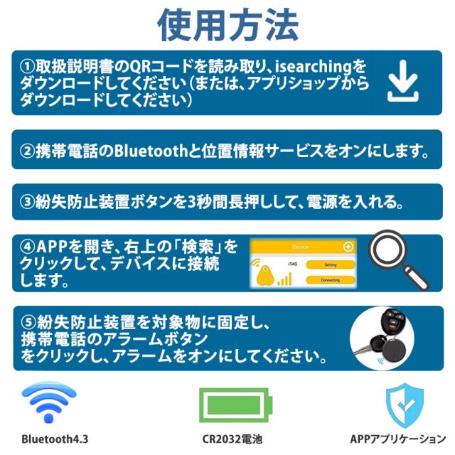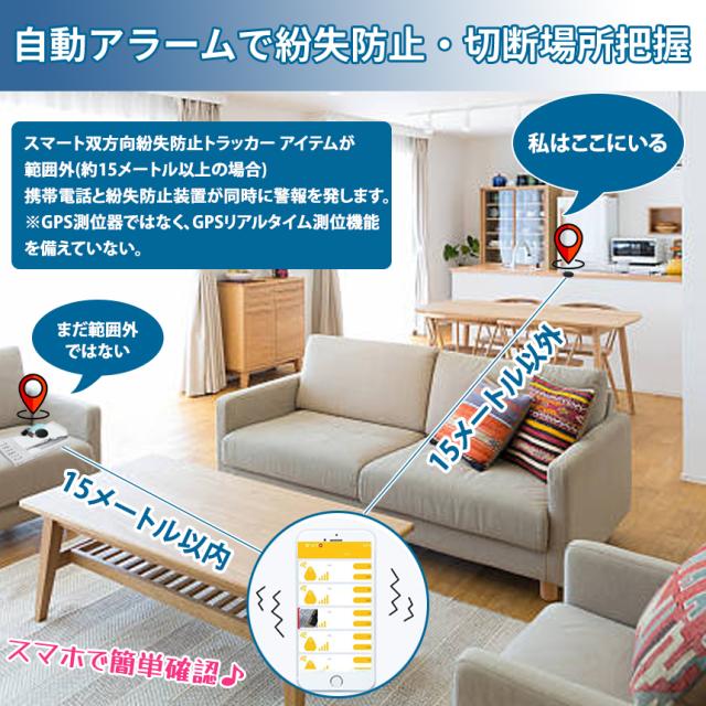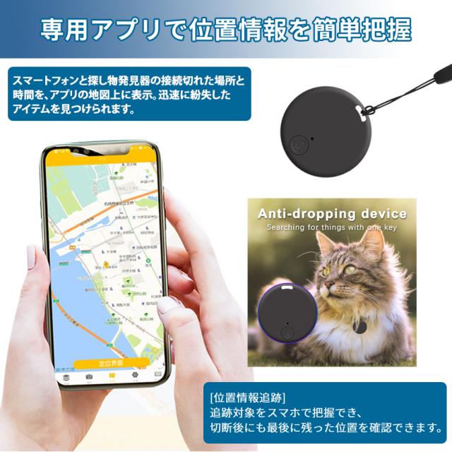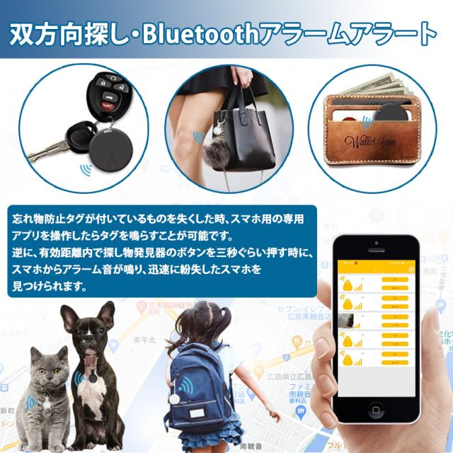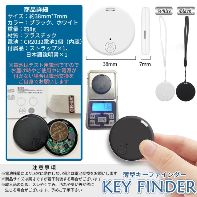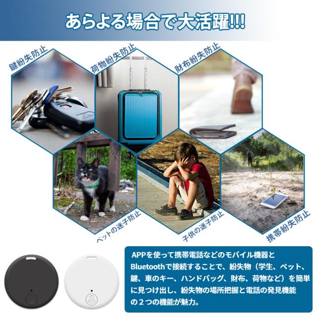 貴重品を失くしやすい人必見です! APPを使ってスマホなどのモバイル機器とBluetoothで接続することで、紛失物(鍵、車のキー、財布、荷物など)を簡単に見つけ出し、紛失物の場所の把握と電話の発見機能の2つの機能が魅力。当社のキーファインダーは、携帯電話の探索にも利用できます。見つからない場合は、スマートキーをダブルクリックしてください。マナーモードやバイブレーションモードにしていても、鳴動して位置情報を知らせます。APPは、スマートフォンと紛失防止タグが最後に切断された場所を記録します。アプリで地図を開くと、紛失物のおおよその位置を把握することができます。スマホとトラッカーの距離が離れると、切断されると同時に鳴って知らせてくれるので、忘れ物や紛失があってもすぐに分かります。サイズ:約38mm*7mmカラー:ブラック、ホワイト重量:約8g材質:プラスチック電池:CR2032電池1個(テスト用電池内蔵)※テスト用の電池の為、電池の寿命があまり長くありませんので、 電源がつかない場合は、新しい電池でお試し下さい付属品:ストラップ×1、日本語説明書×1※詳細は画像にてご確認ください