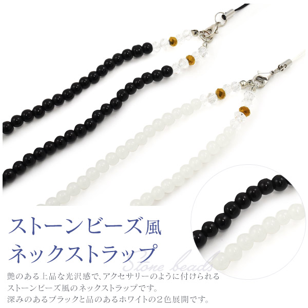 | ストーンビーズ風のネックストラップです。 ストラップホールがあるスマホケースや財布に装着することで、 首から提げることができ、持ち運びにも便利! ポケットや鞄から取り出す手間がなく、使い勝手も抜群です。 旅行先やペットの散歩など、外出時でもオススメです。 深みのあるブラックと品のあるホワイトの2色展開です。 | ||||||||||||