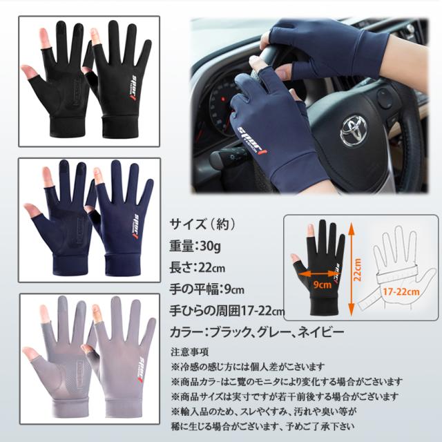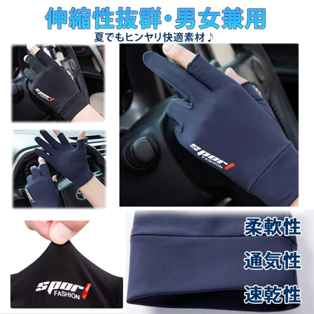 「指が出たフィット手袋」糸結びやスマホ操作可能♪[通気速乾/接触冷感]通気性の良い生地を採用。手汗をすぐに吸収&発散♪夏でも蒸れにくい、爽やかな使用感が持続します。接触冷感素材なので、ひんやりとした使用心地、夏用にぴったりです。[UVカット/指出しタイプ]シンプルなデザイン、男女兼用!日焼けを防ぎ紫外線から手を保護します。手袋を脱かなくてスマホの操作や釣りのライン結束も楽々できます。[フィット感抜群・滑り止めつき]伸縮性抜群、人体工学に基づいたデザインで、フィット感をUP!手のひら部には滑り加工を施しました。車の運転時や、自転車やオートバイのハンドルなどもしっかり掴める♪【商品仕様】パッケージ内容:手袋 左右セットcolor:ブラック、グレー、ネイビーサイズ:画像参照[注意事項]※冷感の感じ方には個人差がこさいます※商品サイズは実寸ですが若干前後する場合がございます※輸入品のため、スレやくすみ、汚れや臭い等が※モニターにより色合いが若干前後する場合がございます。※仕様やデザイン、パッケージ等は予告なく変更される場合がございます。※詳細は画像にてご確認ください