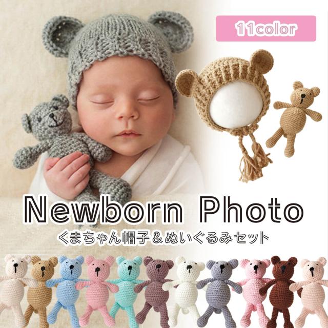 ニューボーンフォト ベビー ぬいぐるみ くま 2 帽子 クマ 11カラー 寝相アート ニット 衣裳 コスチューム セット 写真撮影 記念 記念写真 年賀状 男の子 女の子 新生児 乳児 出産祝い プレゼント ユ00582