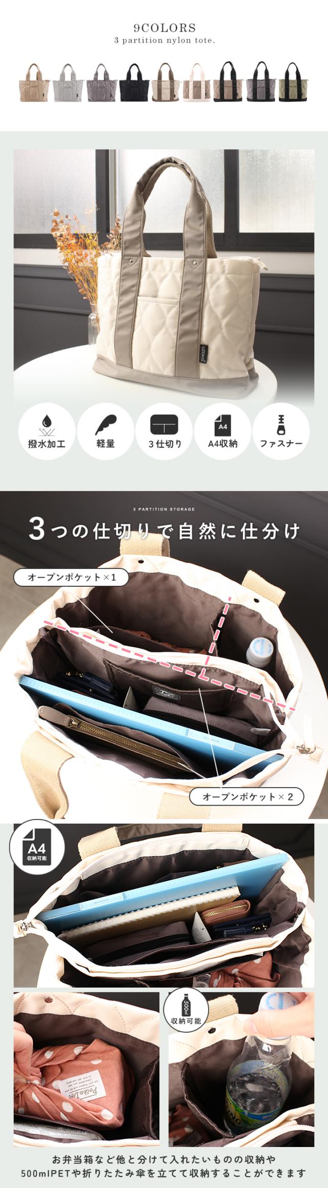トートバッグ リズデイズ キルティング レディース トート 仕切り A4 軽量 軽い 撥水 ナイロン 大容量 多収納 通勤 通学 お出かけ 肩掛け ポケット かわいい おしゃれ 上品 シンプル LIZDAYS スタイルオンバッグ 【lz-51501r】