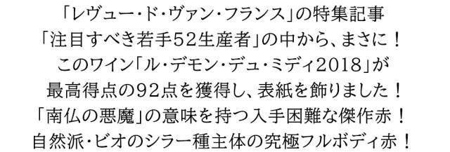 「レヴュー・ド・ヴァン・フランス」の特集記事「注目すべき若手52生産者」の中から、まさに!このワイン「ル・デモン・デュ・ミディ2018」が最高得点の92点を獲得し、表紙を飾りました!「南仏の悪魔」の意味を持つ入手困難な傑作赤!自然派・ビオのシラー種主体の究極フルボディ赤!■さまざまなギフトアイテムをご用意しております。お中元 ギフト 御中元 お盆 お礼 敬老の日 クリスマス 冬ギフト お歳暮 御歳暮 お年賀 御年賀 お正月 年末年始 ご挨拶 バレンタイン ホワイトデー お返し 父の日 母の日 ギフト 贈答品 お土産 手土産 御祝 御礼 内祝い 引き出物 お祝い 結婚祝い 結婚内祝い 出産祝い 出産内祝い 引き菓子 快気祝い 快気内祝い 進学祝い 誕生日祝い バースデーケーキ プレゼント Wedding ウェディング ホームパーティ お花見 パーティ 退職ギフト 退職 就任祝い