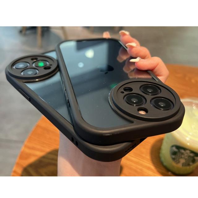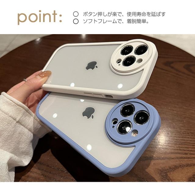 【全面保護】フレーム部分はやわらかシリコン素材、背面は丈夫なPC(ポリカーボネート)素材で、2つの素材を使用したハイブリッドケースです。剛と柔を組み合わせた構造で傷や衝撃に強いです。不意の落下や衝撃からしっかりと保護します。柔らかいフレーム部分は付け外しの際に本体を傷つかず着脱も簡単です!画面側のエッジとカメラ周りの丸い枠が高く設計されているため、カメラレンズや画面が直接床面にぶつかりにくいです。画面とカメラレンズへの保護力を高め、安心です。