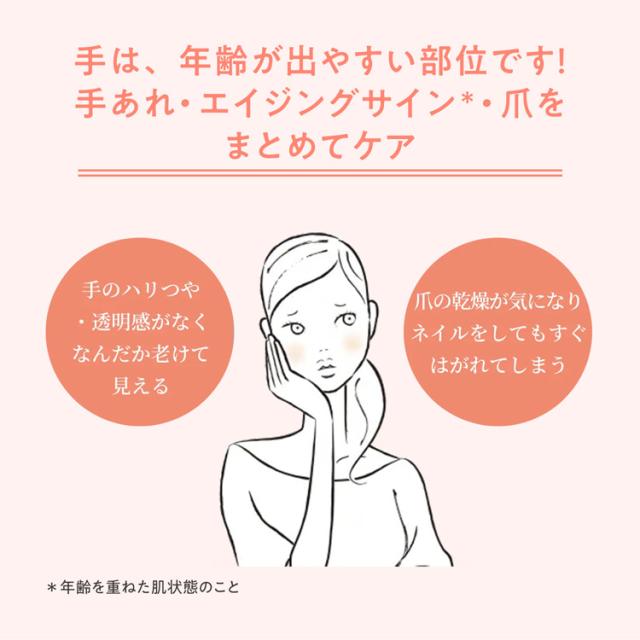 ●ハリ、つやを与え、乾燥による小じわを目立たなくし**、手肌の荒れを予防しながらしなやかな手肌に導き、爪を保護する。