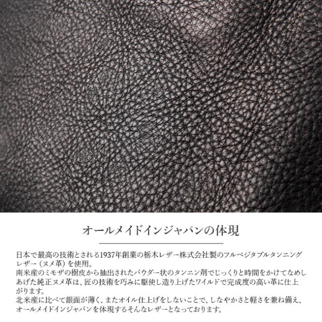 | 本体に日本で最高の技術とされる1937年創業の栃木レザー株式会社製のフルベジタブルタンニングレザー(ヌメ革)を使用しています。古来伝承のピット槽によるフルベジタブルタンニンなめし専門タンナーとして世界的にも知られています。南米産のミモザの樹皮から抽出されたパウダー状のタンニン剤でじっくりと時間をかけてなめしあげた純正ヌメ革は、匠の技術を巧みに駆使し造り上げたワイルドで完成度の高い革に仕上がります。 SLOWの定番シリーズで使われている bono・rubono の原皮は北米産なのに対し、こちらのシリーズは日本国内の厳選した牛革を使用しています。北米産に比べて銀面が薄く、またオイル仕上げをしないことで、しなやかさと軽さを兼ね備えています。オールメイドインジャパンを体現するそんなレザーとなっております。 |