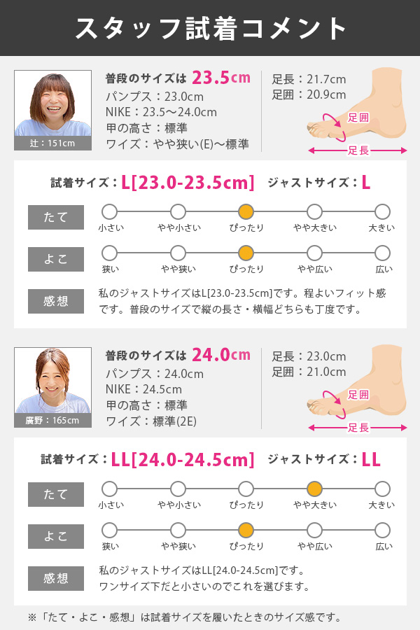 取り扱いサイズ:S[21-21.5cm] M[22-22.5cm] L[23-23.5cm] LL24-24.5cm]