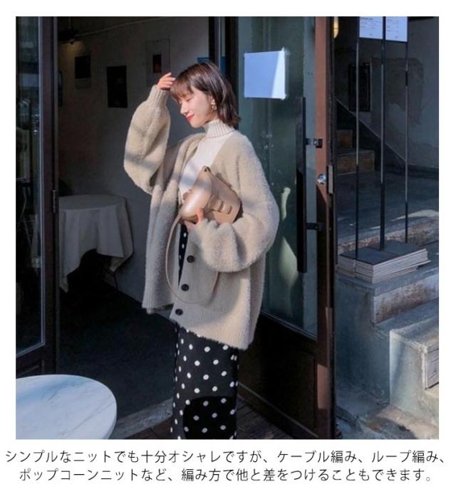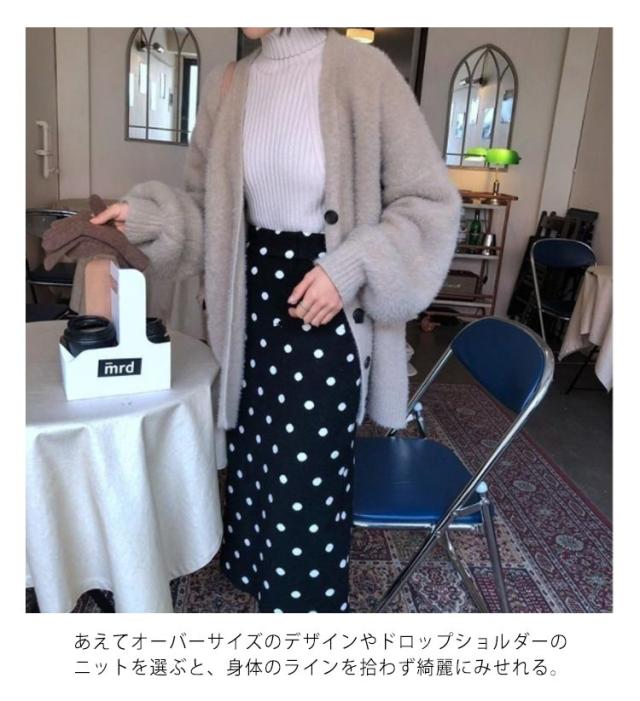 | ○着痩せしてみせたい →あえてオーバーサイズのデザインやドロップショルダーのニットを選ぶと、身体のラインを拾わず綺麗にみせれる。 ○オシャレにみせたい →シンプルなニットでも十分オシャレですが、ケーブル編み、ループ編み、ポップコーンニットなど、編み方で他と差をつけることもできます。 毎日のコーデの時短ができる。 ○部屋着にも使いたい →インスタグラマーやモデルなどの間でニット素材の部屋着も流行しています。ゆったりした雰囲気を出しながらニットのスタイリッシュさも出るので お友達が遊びに来た際などの部屋着にピッタリです。 | |