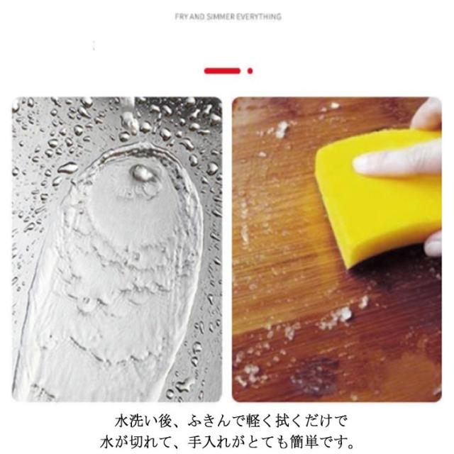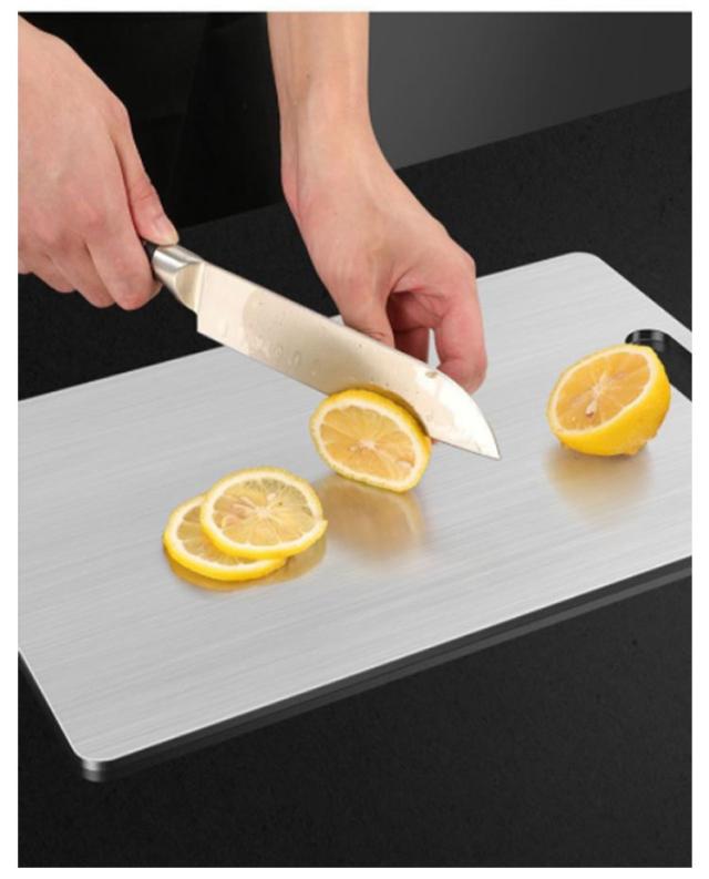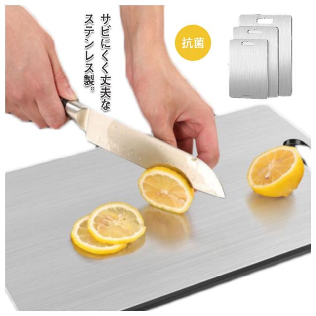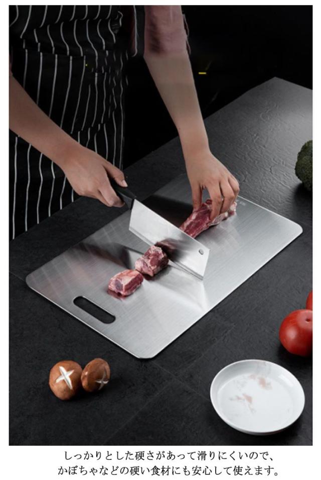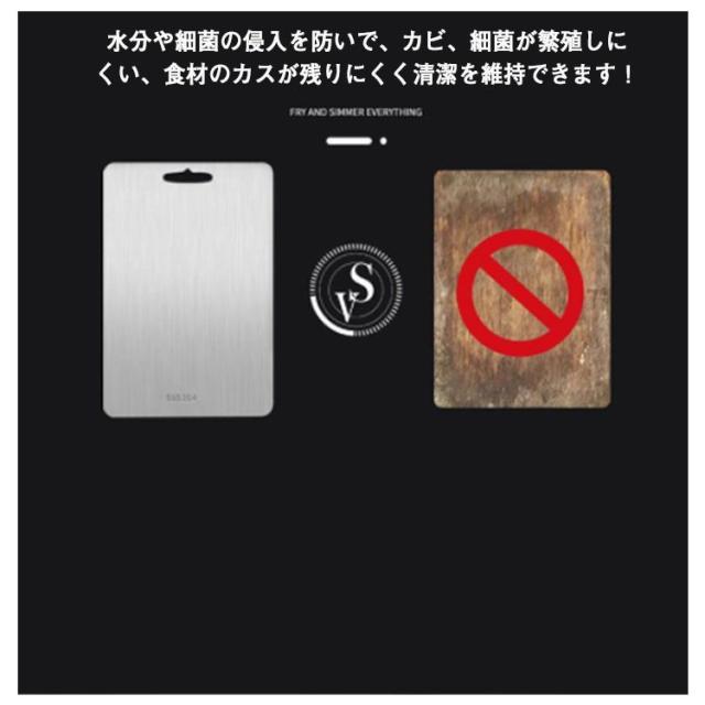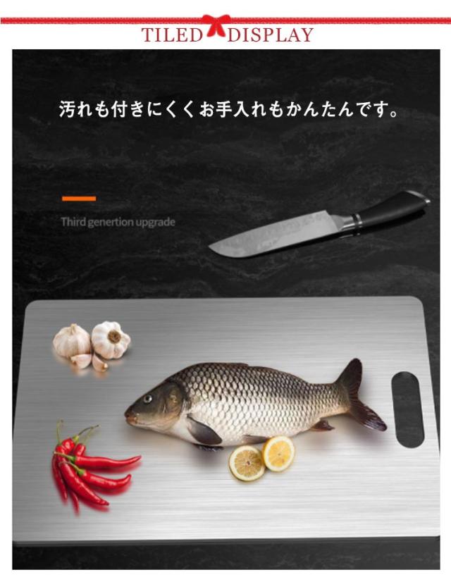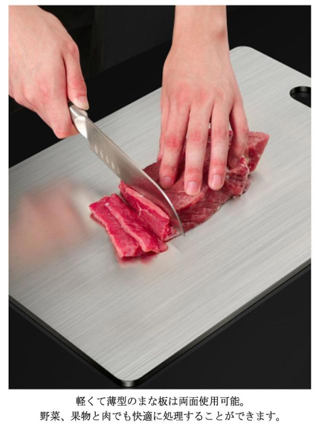 | サビにくく丈夫なステンレス製。汚れも付きにくくお手入れもかんたんです。 軽くて薄型のまな板は両面使用可能。野菜、果物と肉でも快適に処理することができます。 水分や細菌の侵入を防いで、カビ、細菌が繁殖しにくい、食材のカスが残りにくく清潔を維持できます! 水洗い後、ふきんで軽く拭くだけで水が切れて、手入れがとても簡単です。 しっかりとした硬さがあって滑りにくいので、かぼちゃなどの硬い食材にも安心して使えます。 | |
