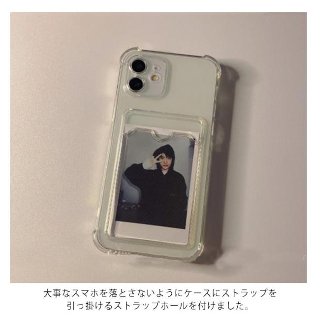 | 大事な写真も入れるクリアスマホケース 本体は耐久性や強度が優れた素材を採用して、大切なスマホをしっかり保護します。 4つの角部分が高く設計されていることにより、傷つきにくい仕様になっています。 バック部分は写真を入れるポケットデザイン!家族、恋人やお好きなのスターの写真はケースに収納できます♪ 大事なスマホを落とさないようにケースにストラップを引っ掛けるストラップホールを付けました。 | |
