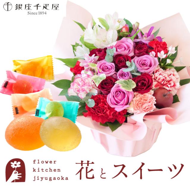 花とスイーツのセット ロゼットアレンジ「ピンクレッド」+【銀座千疋屋】ひとくちフルーツゼリーセット プレゼント 誕生日 記念日 お祝い花 即日発送 あすつく メッセージカード FKAASW