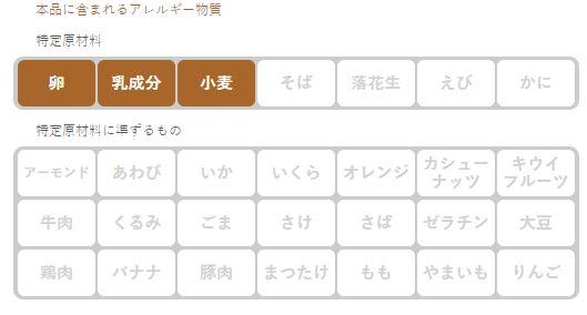 原材料名:小麦粉(国内製造)、マーガリン、卵、砂糖、殺菌凍結卵黄(卵黄、砂糖)、ファットスプレッド、脱脂粉乳、食物繊維、乳等を主要原料とする食品、果糖ぶどう糖液糖、パン酵母、食塩、糖加工品(異性化液糖、デキストリン)/乳化剤、香料、加工澱粉、調味料(アミノ酸)、pH調整剤、酸化防止剤(V.E)、酵素、着色料(抽出カロチン)、(一部に小麦・卵・乳成分を含む)