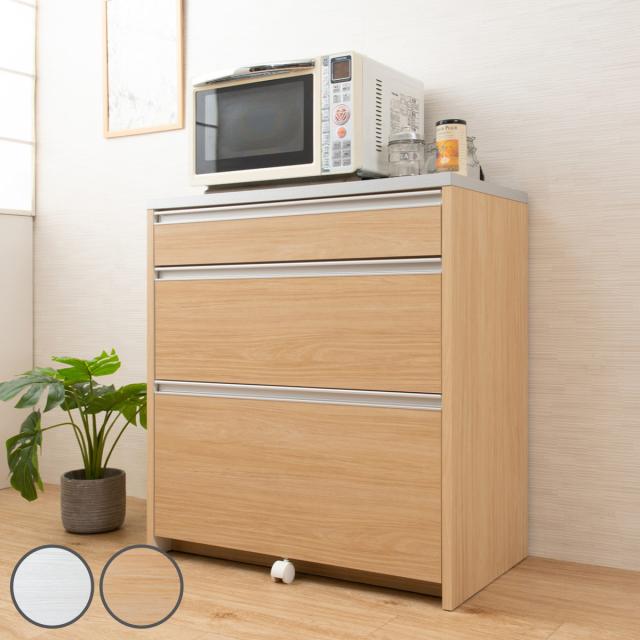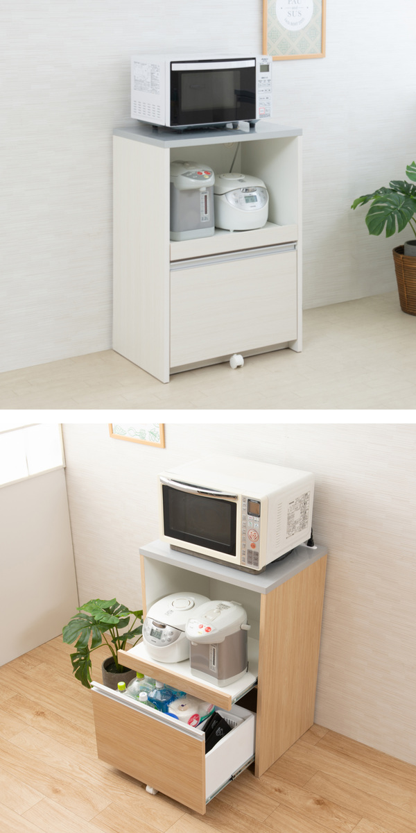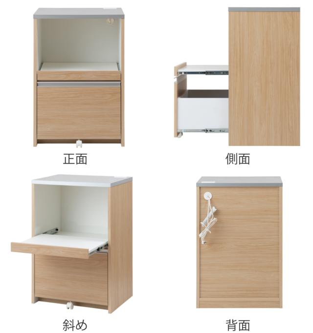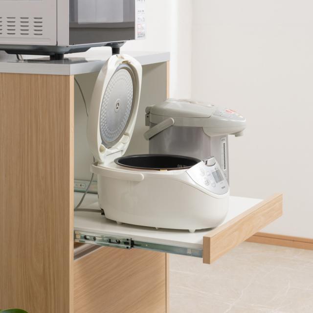 消耗品のストックの収納にぴったりな引出しや、汚れにくくお手入れがしやすい木目調ハイグロス天板など、収納も機能も充実したレンジ台です。キッチンで必要な家電を一ヶ所にまとめて設置することができるので作業効率もアップします。