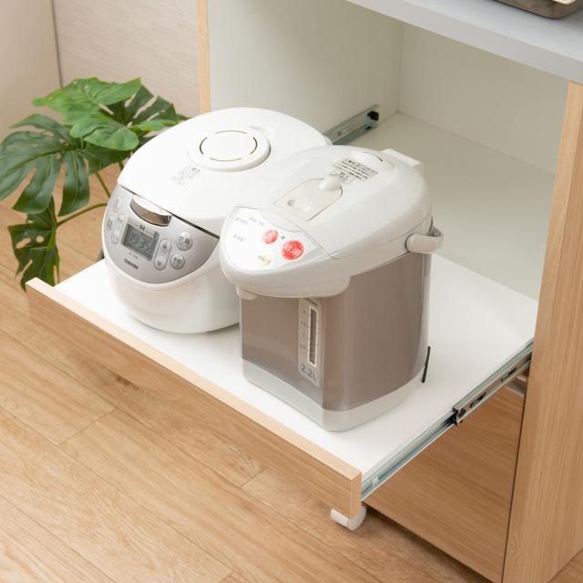 手前いっぱいまで引き出すことができるフルスライドレール仕様のテーブルは、炊飯器やポットなどの蒸気の出る家電の設置にぴったりです。