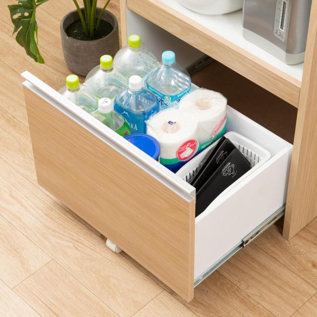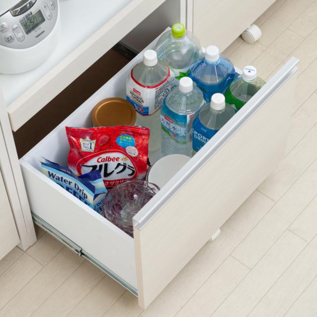 引出しはペットボトルや背の高い調味料、消耗品のストックなどかさばる物の収納にもおすすめです。引出し内部までお手入れのしやすい化粧仕上げで、いつも清潔に保つことができます。