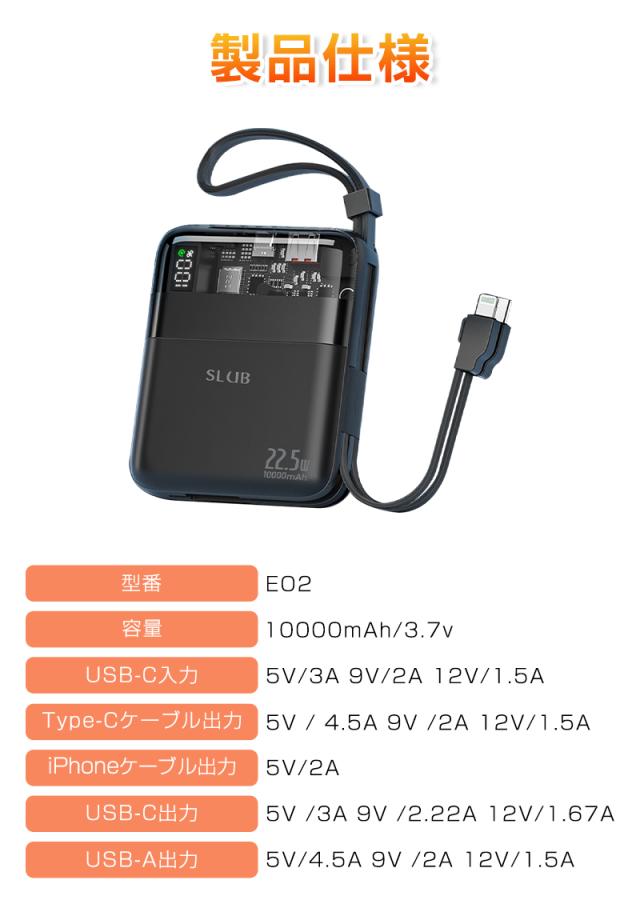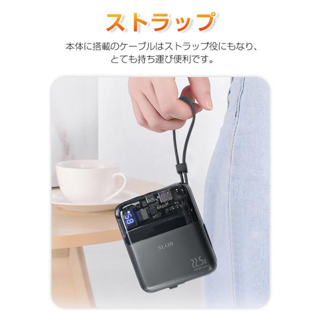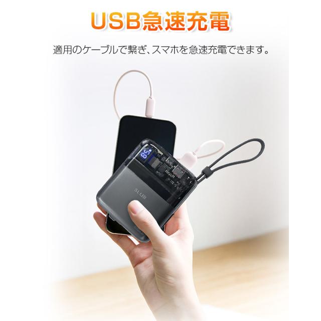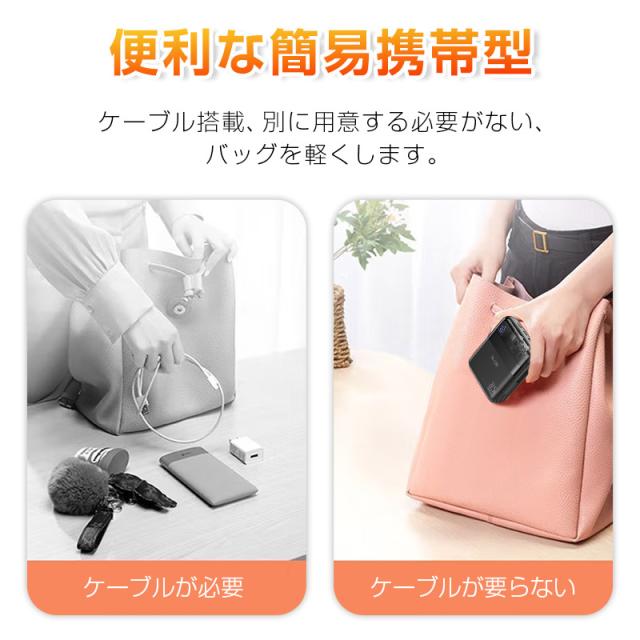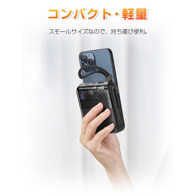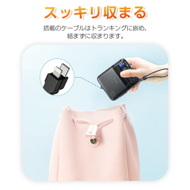【ケーブル内蔵】iPhoneとType-Cの2種類ケーブルが搭載しており、ケーブルを持ち運ぶ必要がなく、Android端末の充電もiOS端末の充電もこのモバイルバッテリー1つでサポートします。