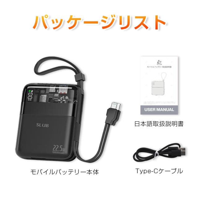 モバイルバッテリー本体、Type-Cケーブル、日本語取扱説明書。