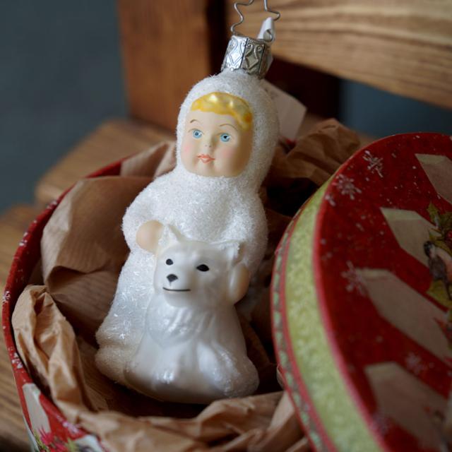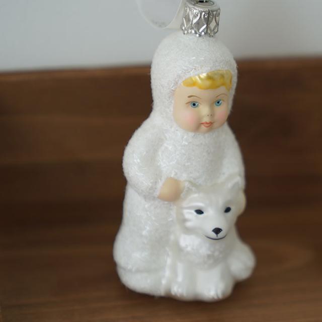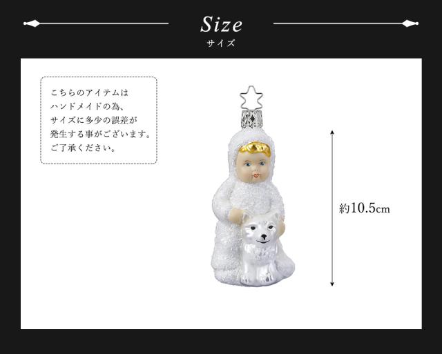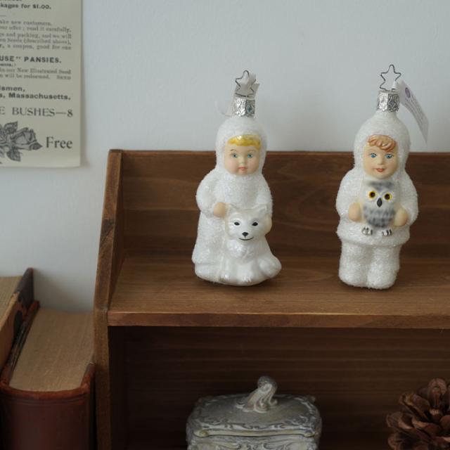 ★当店でも大変人気の高い『雪のこどもたち』ラインから、白キツネと遊ぶこどものオーナメントです。 大親友のふたりは、今日も冬の森でめいっぱい遊びまわります。 その姿はまるで、ふわふわのパウダースノーの衣をまとった雪の妖精のような愛らしさ。 服に降り積もった雪を表現した白いグリッターが特徴的で、光に反射してキラキラと輝きます。まるで、豊かな大自然に囲まれた森の中で、雪遊びを満喫しているかのようです。こどものきれいな青色の瞳がとても魅力的ですね。 シンプルでかわいい印象がありながらも幻想的で洗練された存在感を放つガラスオーナメントです。 クリスマスツリーのオーナメントとして飾るのはもちろん、お部屋のインテリアとしてもお楽しみいただけます。 プレゼントや贈り物にもおすすめのアイテムです。サイズは高さが約10.5cmです。 |